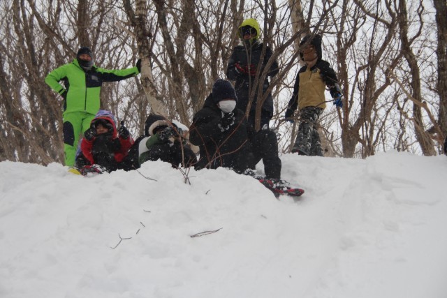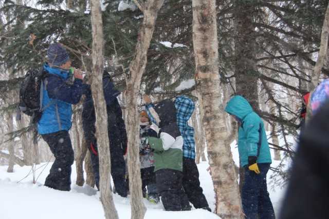 スノーシューを履いて小高い雪山に登り、動物の足跡や冬の木々の様子についてレクチャーを受けました。